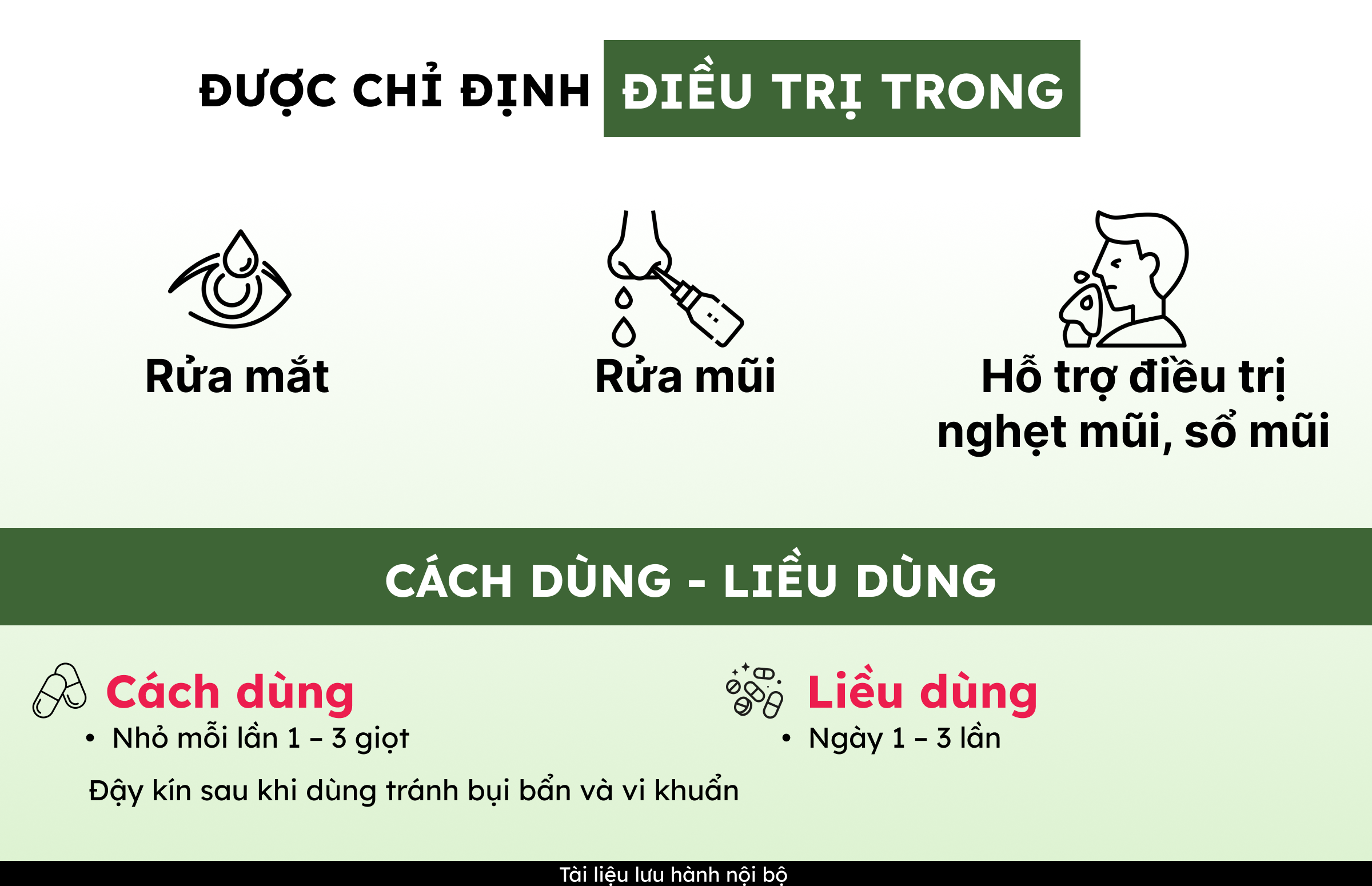 Cách dùng Dung dịch Natri Clorid 0,9% dùng nhỏ hoặc rửa mắt, hốc mũi. Liều dùng Liều thường dùng: Nhỏ mỗi lần 1 - 3 giọt, ngày 1 - 3 lần. Lưu ý: Liều dùng trên chỉ mang tính chất tham khảo. Liều dùng cụ thể tùy thuộc vào thể trạng và mức độ diễn tiến của bệnh. Để có liều dùng phù hợp, bạn cần tham khảo ý kiến bác sĩ hoặc chuyên viên y tế.