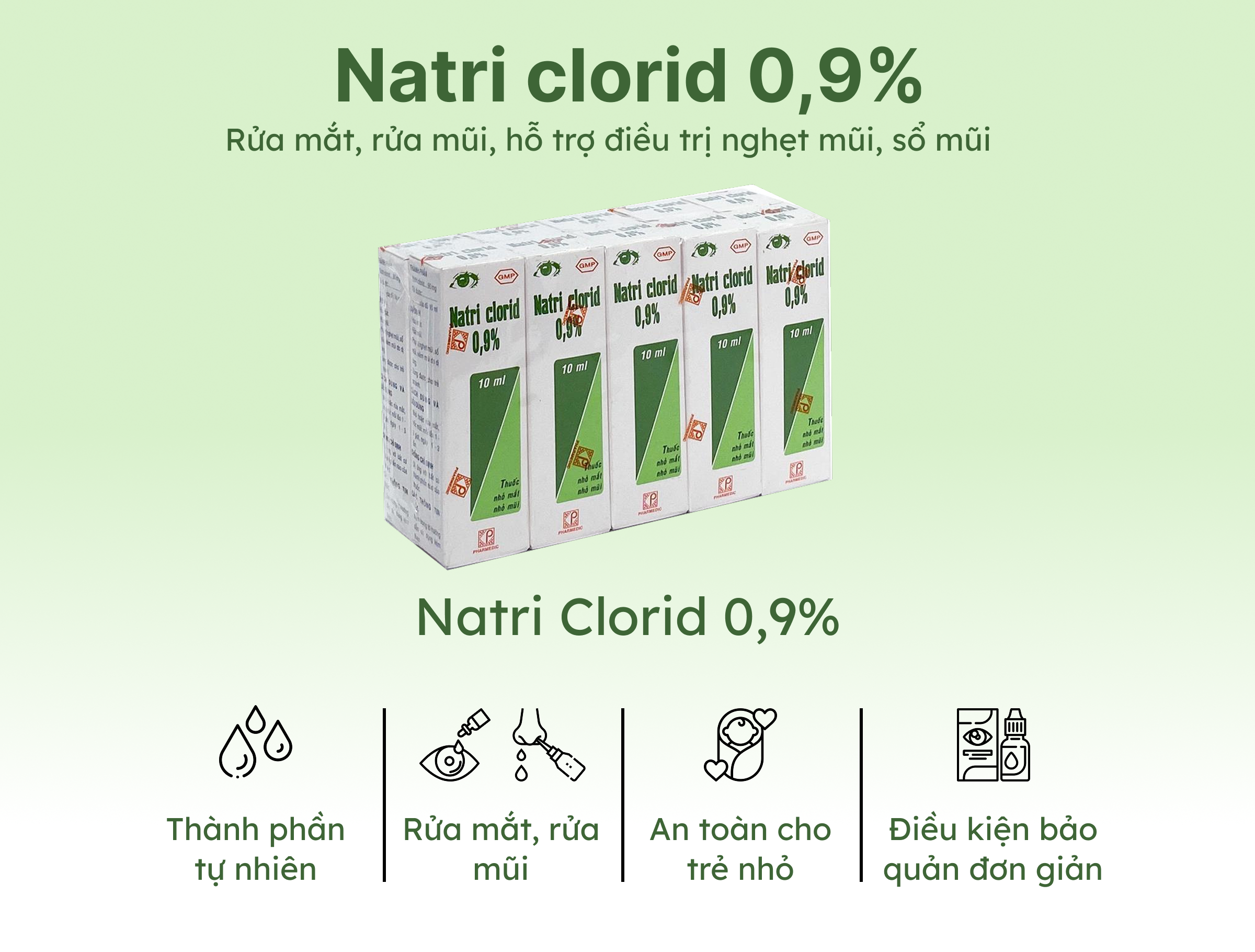 Với công thức an toàn, lành tính, sản phẩm mang đến giải pháp đa năng: rửa sạch mắt, thông thoáng mũi, hỗ trợ điều trị nghẹt mũi, sổ mũi, viêm mũi do dị ứng. Được các bác sĩ Tai – Mũi – Họng khuyên dùng, Natri Clorid 0,9% không chỉ giúp làm sạch bụi bẩn, dịch nhầy mà còn mang lại cảm giác dễ chịu, dịu nhẹ cho đôi mắt và khoang mũi.